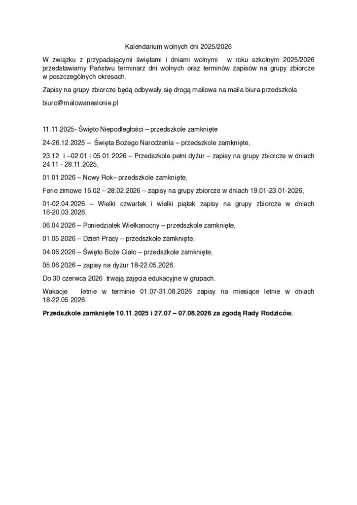 15.08.2025 – Święto Wniebowzięcie Najświętszej Maryi Panny– przedszkole zamknięte